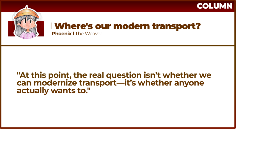 At this point, the real question isnât whether we can modernize transportâitâs whether anyone actually wants to. If commuters continue to accept inefficiency as the norm, we are silently endorsing a system designed to profit from our pain. While Malampaya promises cheaper fuel and energy security, buses here will keep disappearing without warning, and we will keep waiting.